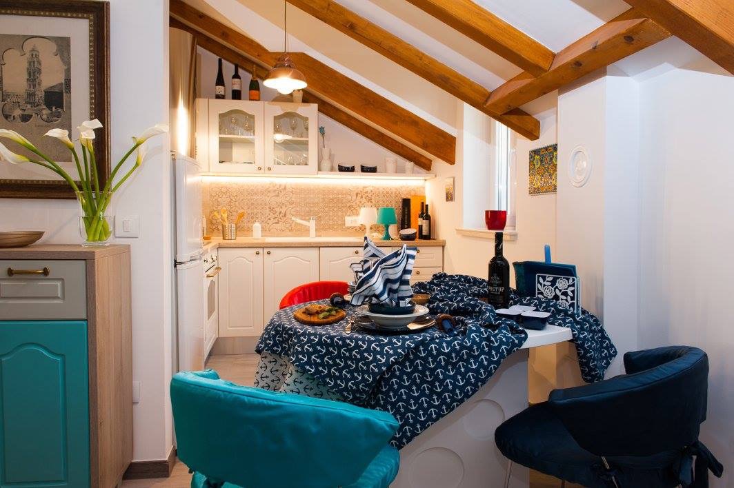 Apartman koji je uredila arhitektica Deana Matić pomalo je eklektičnog stila s morskih štihom. Osim naše Mare Nostrum satenske posteljine, cijelu priču upotpunjuju ručnici Mare i Croatica te dekor Mare.